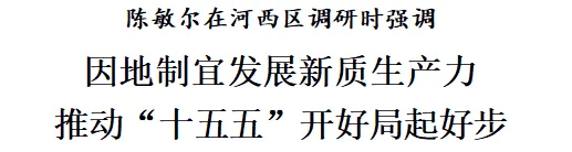 陈敏尔在调研中强调,河西区作为经济大区,要深入贯彻习近平总书记视察天津重要讲话精神和对天津工作一系列重要指示要求,全面落实市委十二届八次全会暨市委经济工作会议部署要求,用好“三新”、“三量”等工作抓手,推动经济实现质的有效提升和量的合理增长,为全市发展大局作出贡献。在因地制宜发展新质生产力上担当作为、善作善成,高标准建设天开高教科创园河西园等平台载体,提升创新策源能力、成果转化能力,运用智能化技术助力传统产业改造升级,积极发展生物医药、商业航天、具身智能等战略性新兴产业和未来产业。在加快发展现代服务业上担当作为、善作善成,加强细分行业研究谋划,发展壮大科技服务、金融服务、数字经济、设计服务、商务服务等生产性服务业,繁荣发展文旅、养老等生活性服务业,引育更多优质经营主体,在盘活存量中做优增量。在着力建设创新生态上担当作为、善作善成,深化科技创新、产业焕新、城市更新,提升城市治理现代化水平,完善公共配套服务,推进商文旅深度融合,持续营造近者悦、远者来的良好环境,提供更多创新场景,更好赋能新产业、新业态、新模式发展。在以高质量党建引领保障高质量发展上担当作为、善作善成,以中央巡视反馈意见整改落实为契机,压紧压实全面从严治党政治责任,抓好班子、带好队伍,强化干部人才支撑,充分调动各方面干事创业的积极性主动性创造性,努力实现“十五五”开好局、起好步。